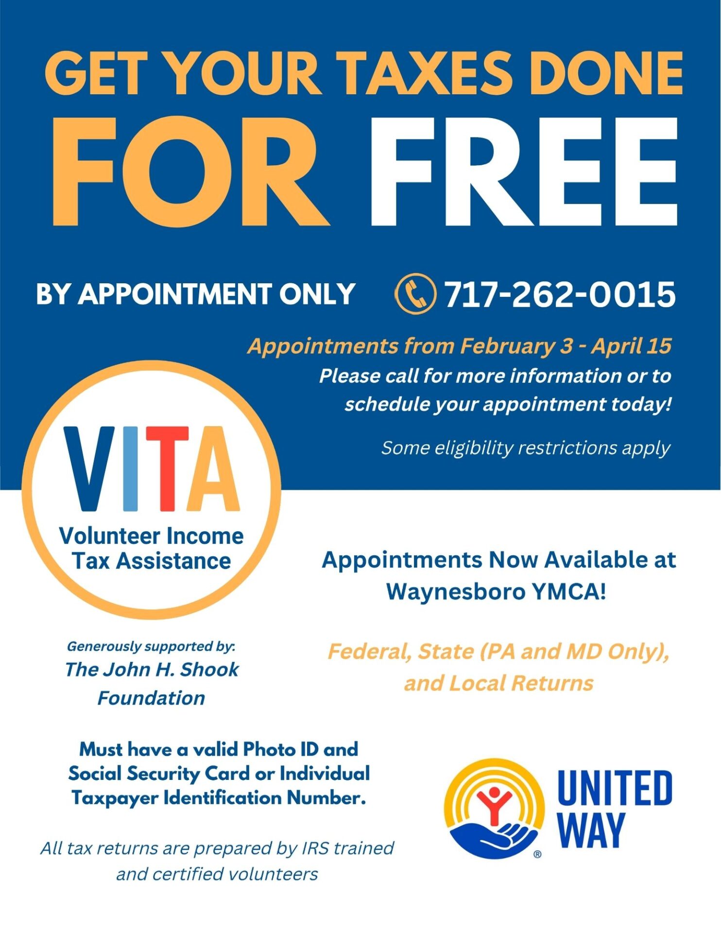 Filing your tax return can be a daunting, expensive task. That’s why the United Way network provides free tax filing support to U.S. residents, through our online MyFreeTaxes service or VITA (Volunteer Income Tax Assistance) program. In both cases, United Way partners with the IRS. Here at the Waynesboro Area YMCA, we are ready to help! Call United Way of Franklin County United Way of Franklin County to schedule an appointment! 717-262-0015